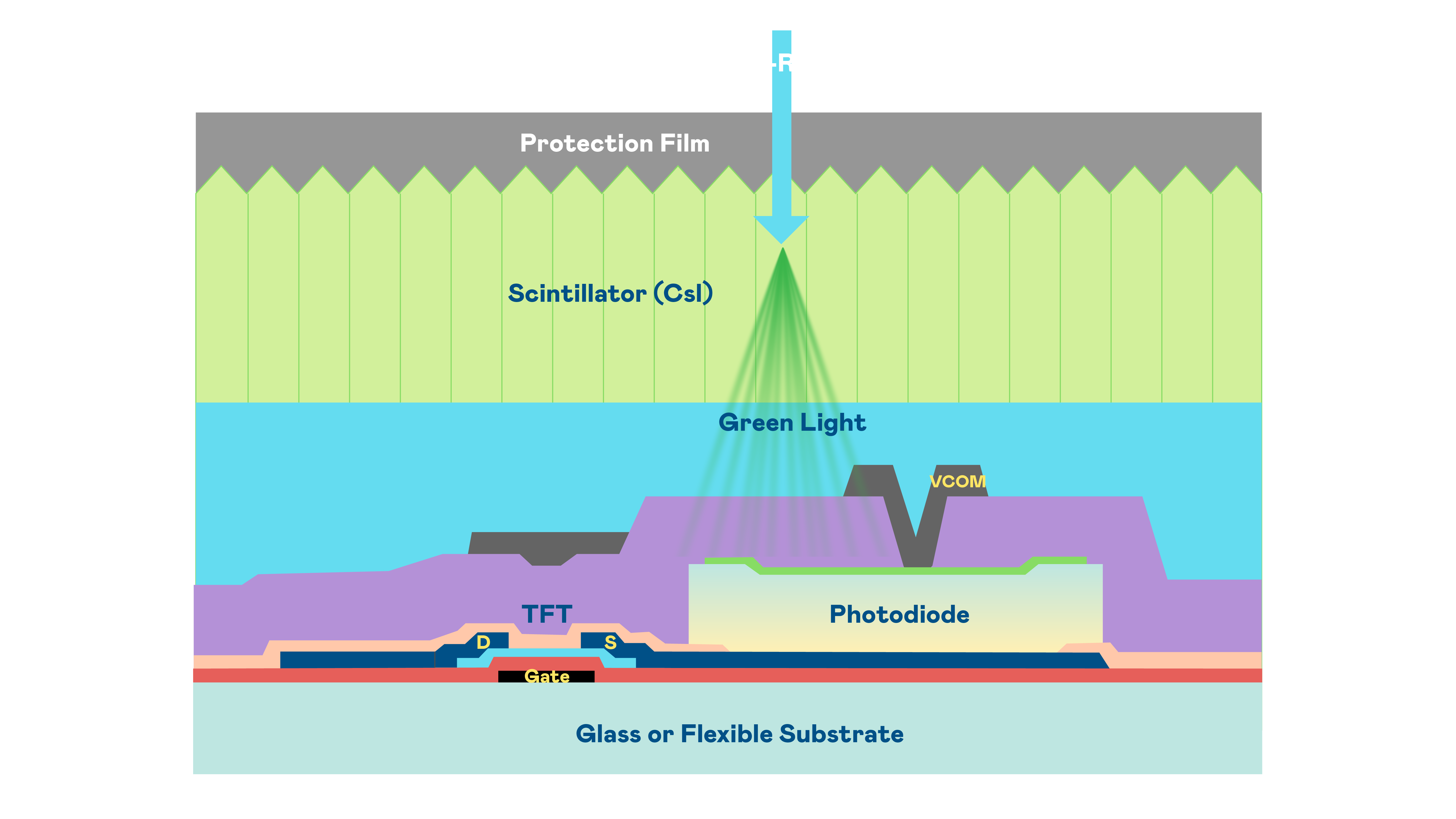 九游的X光影像感测阵列使用薄膜电晶体 (TFT) 作为每个像素的读取开关,搭配光电二极体(Photodiode)的光电转换元件,用以感测X光影像讯号。